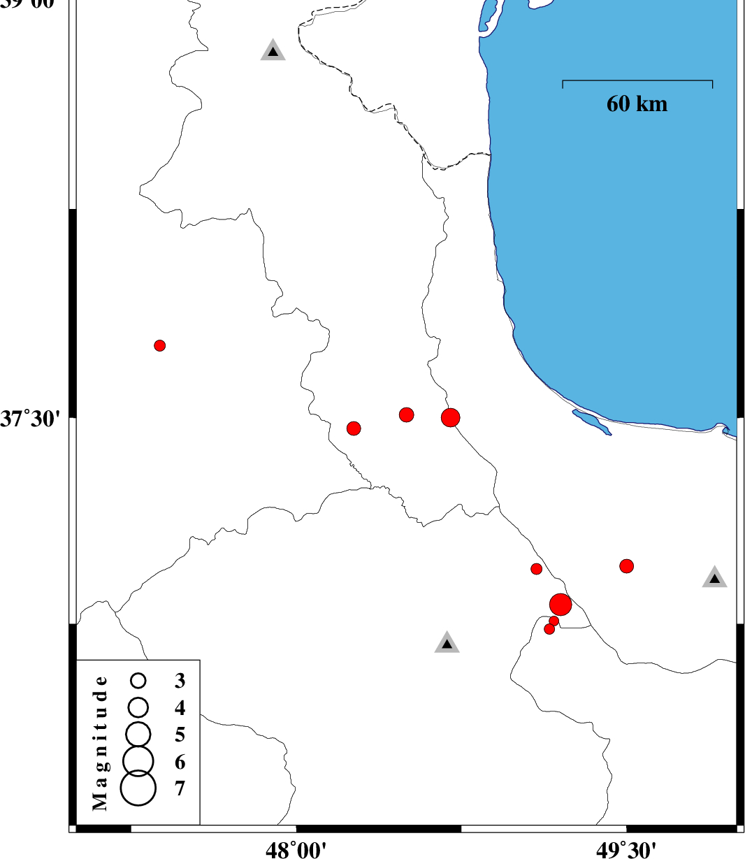 | 2012/03/11 | 03:28:51.3 | 06:58:51.3 | 37.5 | 48.7 | 14 | ML:3.8 | Gilan Province, 20 km South-East of Khalkhal | ||