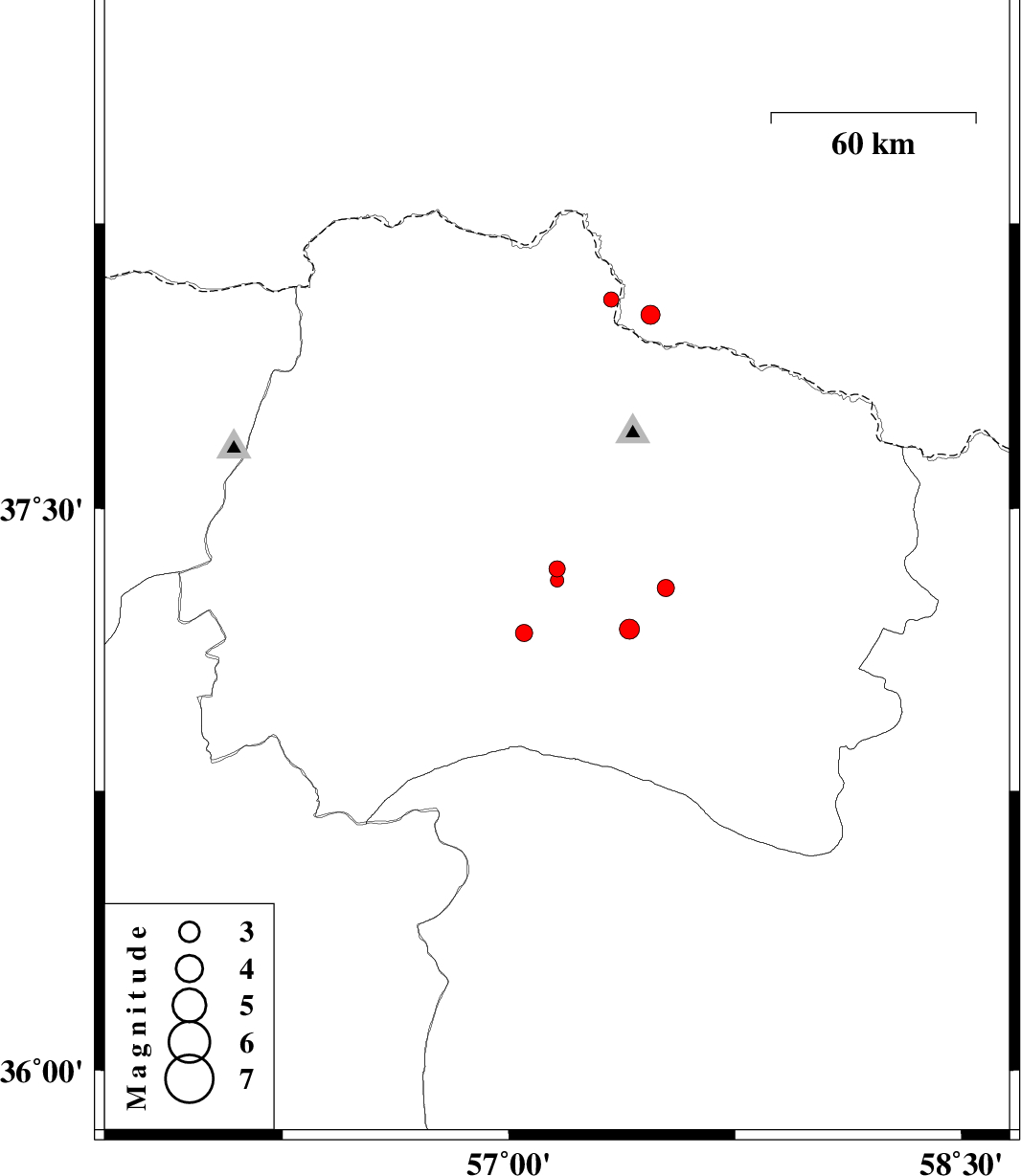 | 2012/03/23 | 07:33:53.3 | 12:03:53.3 | 37.34 | 57.16 | 32 | ML:2.4 | Khorasan(north) Province, 22 km South-West of Bojnurd | ||