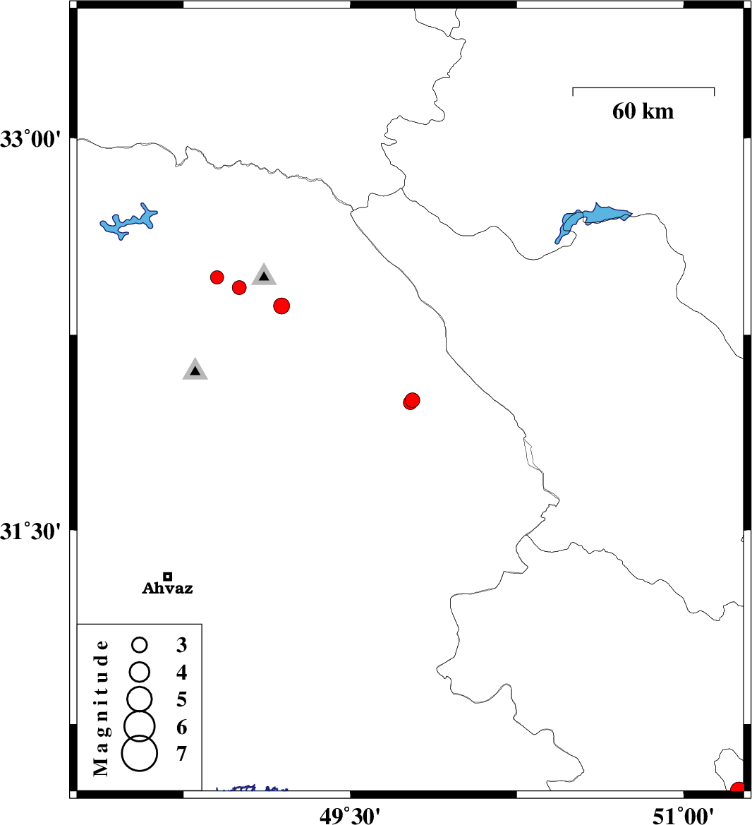 | 2012/03/01 | 01:12:53.7 | 04:42:53.7 | 30.59 | 48.29 | 14 | ML:3.2 | Khoozestan Province, 25 km North of Abadan | ||
