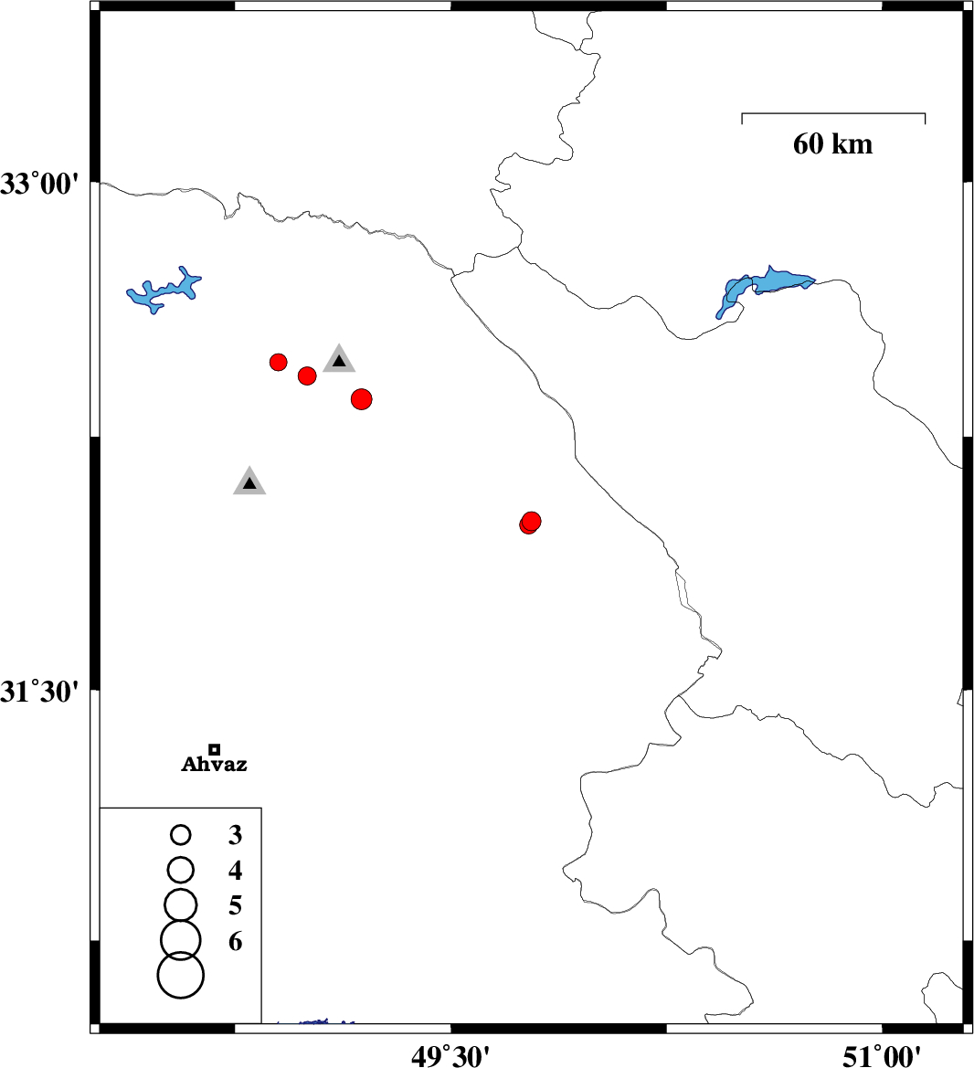 | 2012/03/01 | 01:12:53.7 | 04:42:53.7 | 30.59 | 48.29 | 14 | ML:3.2 | Khoozestan Province, 25 km North of Abadan |