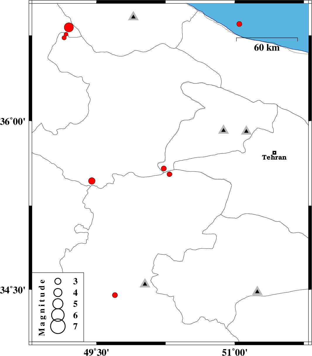 | 2012/03/17 | 01:47:18.1 | 05:17:18.1 | 36.85 | 51.05 | 14 | ML:2.6 | Caspian Sea, 14 km East of Tonekabon |