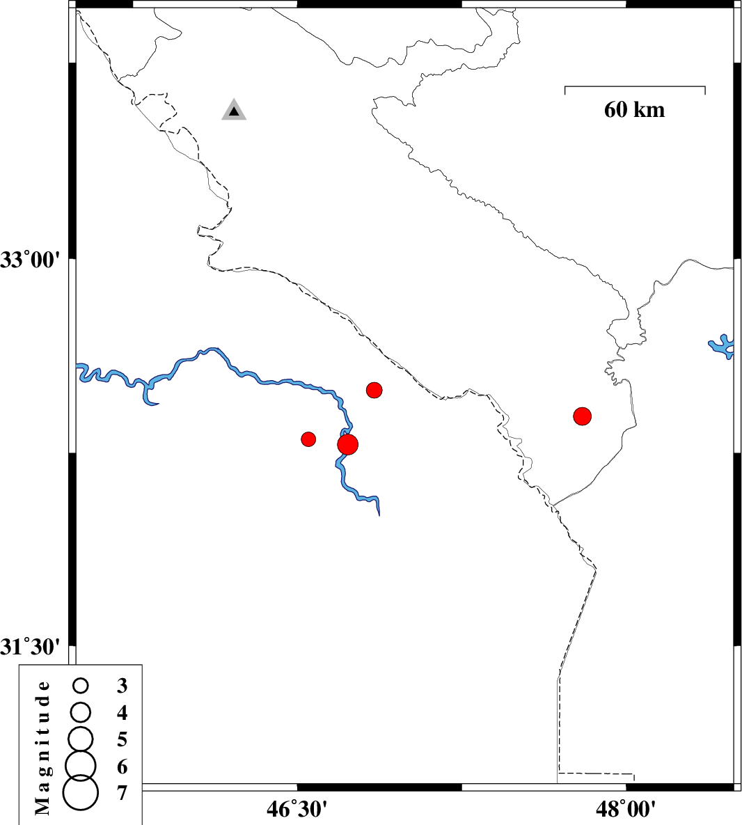 | 2012/03/19 | 04:29:55.1 | 07:59:55.1 | 32.48 | 46.81 | 18 | ML:3 | Iraq, 48 km South-West of Dehloran |