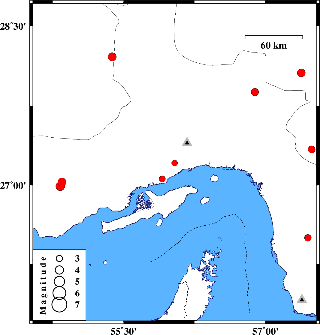 | 2012/03/12 | 05:09:52.6 | 08:39:52.6 | 26.99 | 54.83 | 15 | ML:4.2 | Hormozgan Province, 52 km North of Bandar-e lengeh | ||