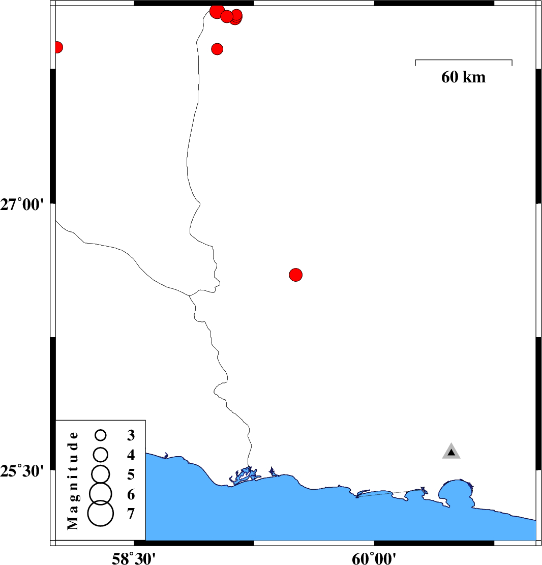 2012/03/11 | 06:03:17.5 | 09:33:17.5 | 27.86 | 59.02 | 15 | ML:3.2 | Sistan va Baloochestan Province, 131 km East of Kahnuj | ||