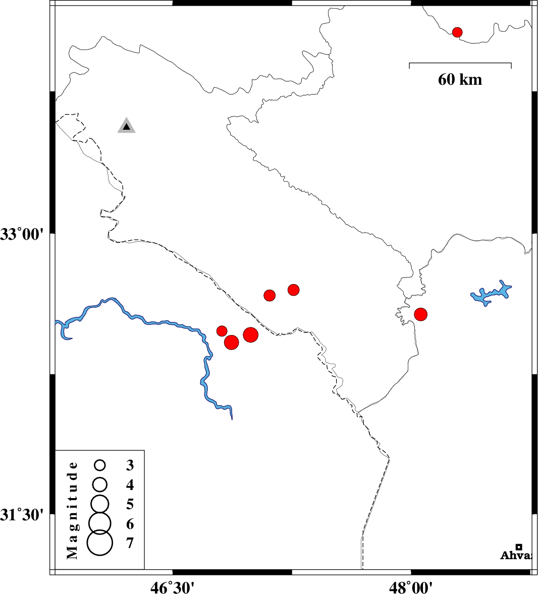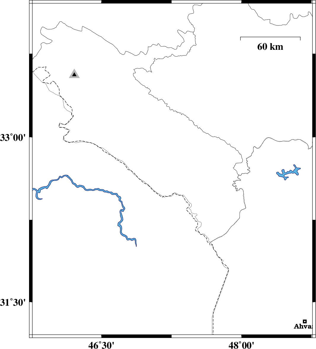 | 2012/03/24 | 05:25:36.7 | 09:55:36.7 | 32.46 | 46.99 | 44 | ML:4.2 | Iraq, 36 km South-West of Dehloran | ||
