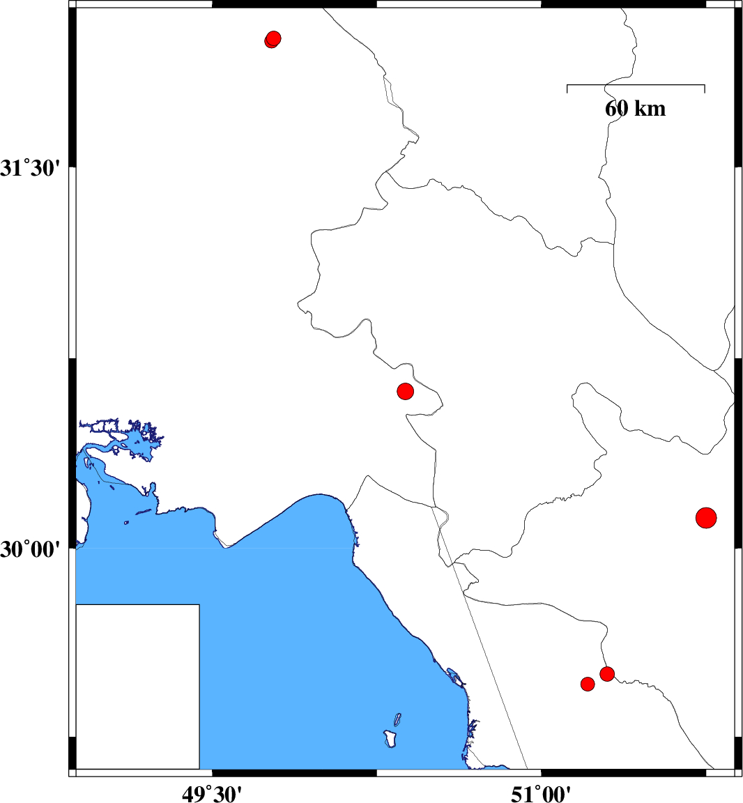 | 2012/03/27 | 00:49:29.4 | 05:19:29.4 | 30.62 | 50.38 | 15 | ML:3.4 | Khoozestan Province, 14 km East of Behbahan | ||
