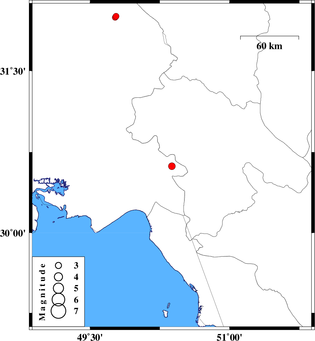 | 2012/03/27 | 00:49:29.4 | 05:19:29.4 | 30.62 | 50.38 | 15 | ML:3.4 | Khoozestan Province, 14 km East of Behbahan | ||
