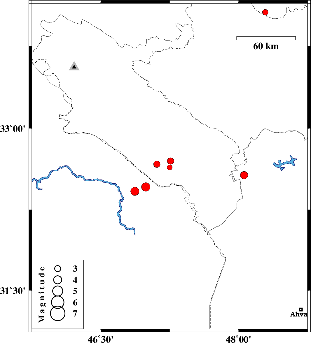 | 2012/03/25 | 12:28:51.3 | 16:58:51.3 | 32.42 | 46.87 | 39 | ML:4.1 | Iraq, 48 km South-West of Dehloran | ||