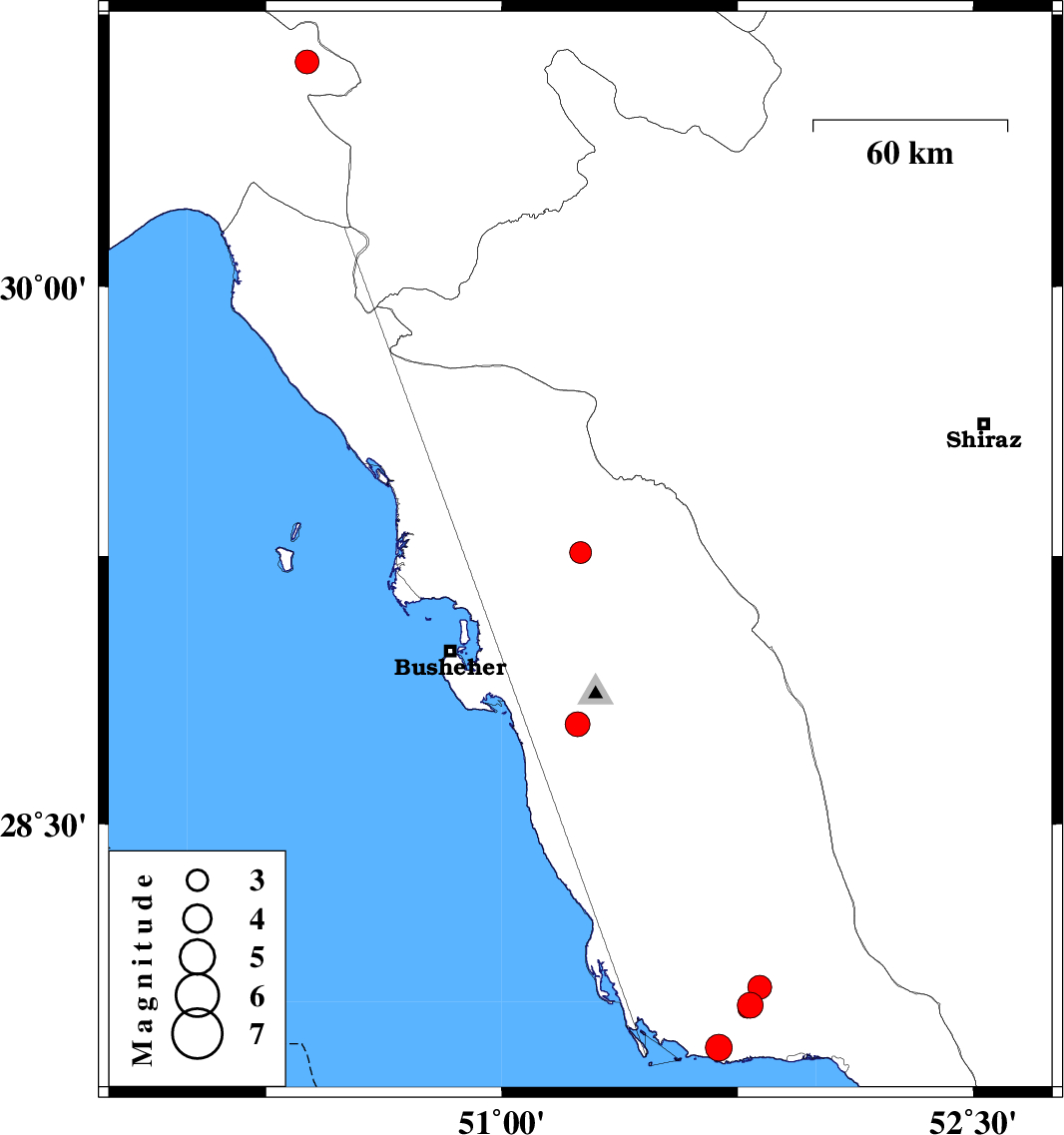 | 2012/03/22 | 16:39:08.2 | 21:09:08.2 | 27.87 | 51.69 | 43 | ML:3.8 | Bushehr Province, 37 km West of Bandar-e kangan | ||