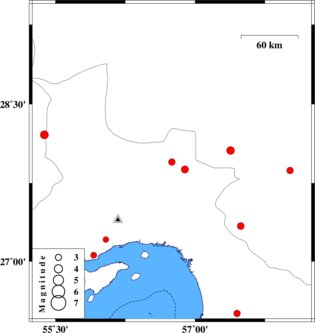 | 2012/03/05 | 19:30:15.2 | 23:00:15.2 | 27.88 | 56.89 | 14 | ML:3.5 | Hormozgan Province, 61 km North-West of Dehbarez | ||