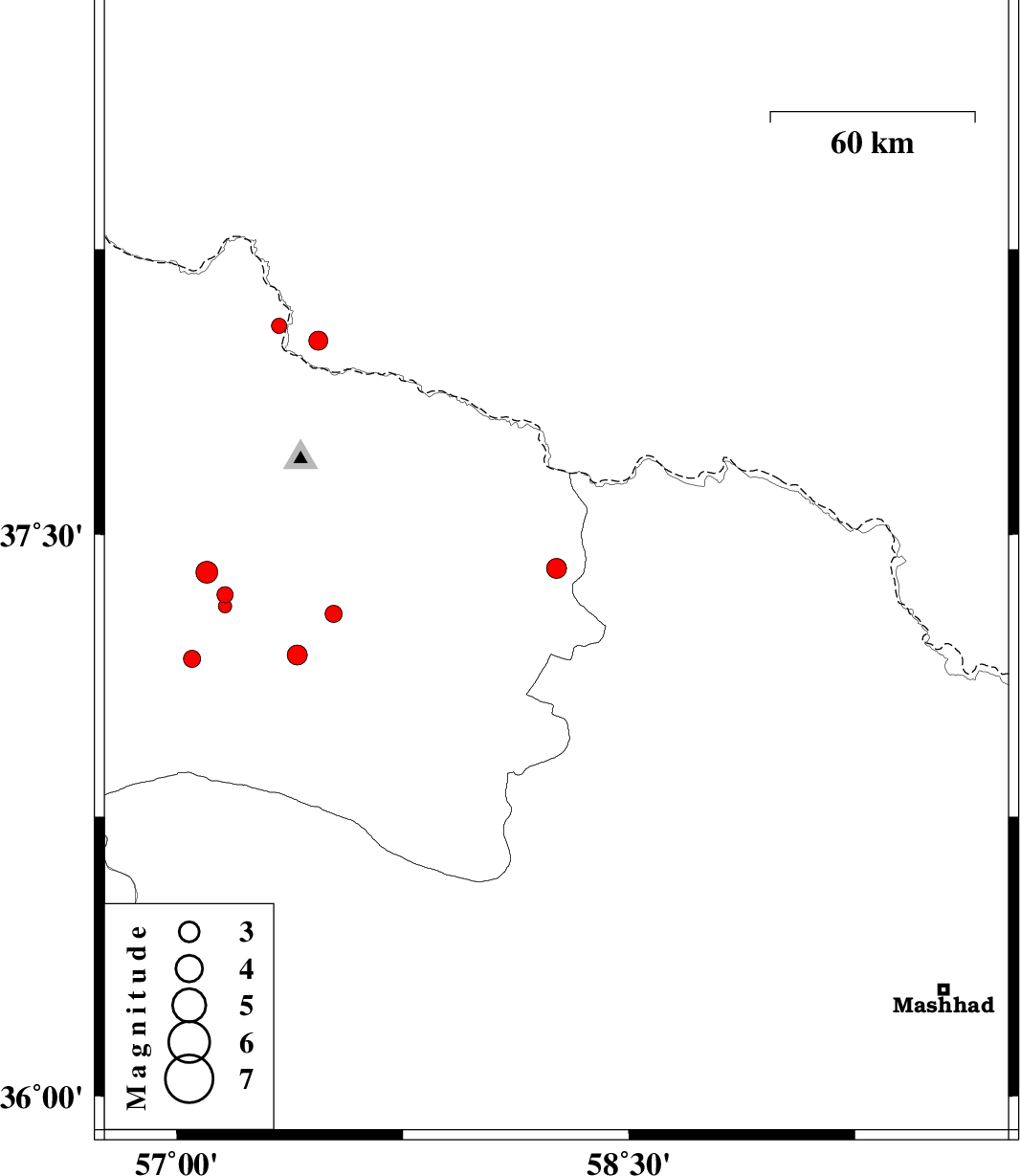 | 2012/03/10 | 15:54:28.6 | 19:24:28.6 | 37.4 | 57.1 | 15 | ML:3.2 | Khorasan(north) Province, 22 km West of Bojnurd |