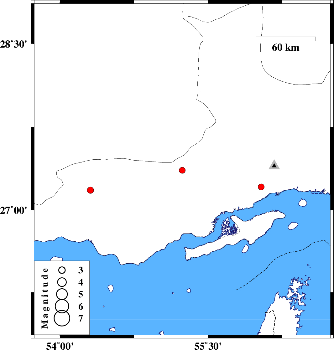 | 2012/03/22 | 18:00:44.1 | 22:30:44.1 | 27.18 | 54.31 | 34 | ML:3 | Hormozgan Province, 6 km Bastak |