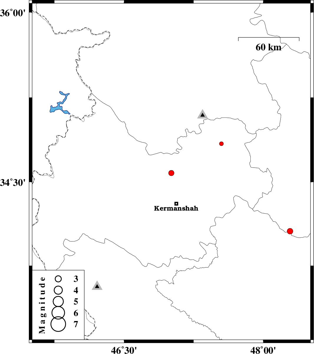 | 2012/03/30 | 02:28:07.0 | 06:58:07.0 | 34.58 | 47.01 | 14 | ML:2.7 | Kermanshah Province, 27 km South of Kamyaran | ||