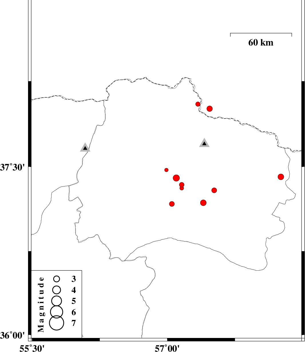 | 2012/03/23 | 07:33:53.3 | 12:03:53.3 | 37.34 | 57.16 | 32 | ML:2.4 | Khorasan(north) Province, 22 km South-West of Bojnurd | ||