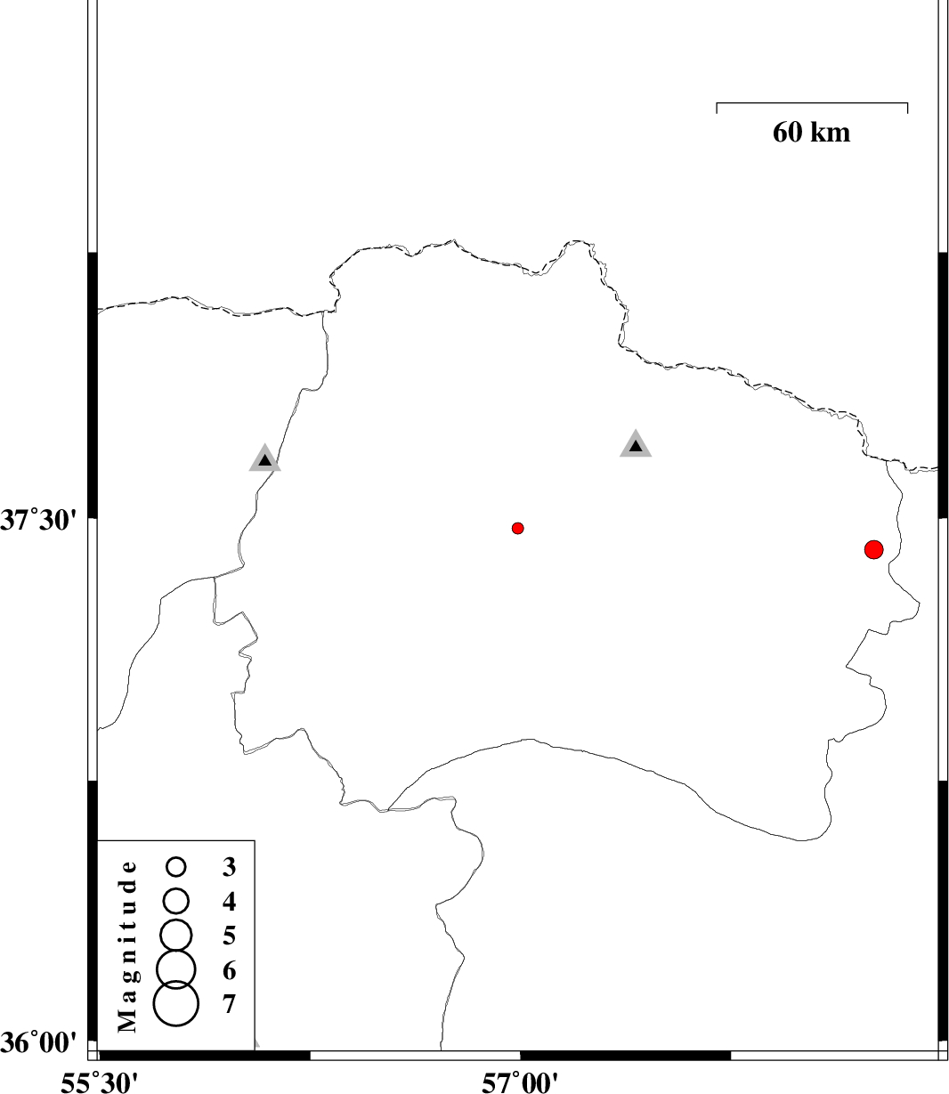 | 2012/03/29 | 10:12:38.7 | 14:42:38.7 | 37.41 | 58.26 | 15 | ML:2.9 | Khorasan(center) Province, 29 km East of Shirvan |