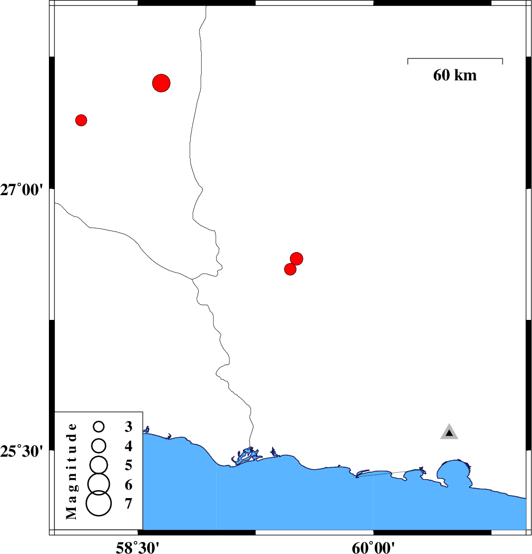 | 2012/03/25 | 07:49:57.4 | 12:19:57.4 | 26.6 | 59.51 | 14 | ML:3.6 | Sistan va Baloochestan Province, 81 km North-West of Nikshahr |