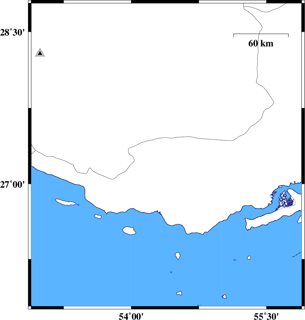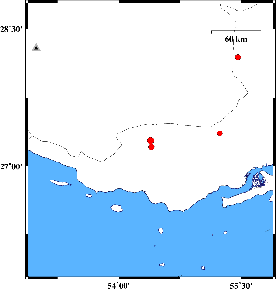 | 2012/03/29 | 22:56:30.9 | 03:26:30.9 | 27.36 | 55.24 | 14 | ML:2.8 | Hormozgan Province, 89 km North-East of Bastak |