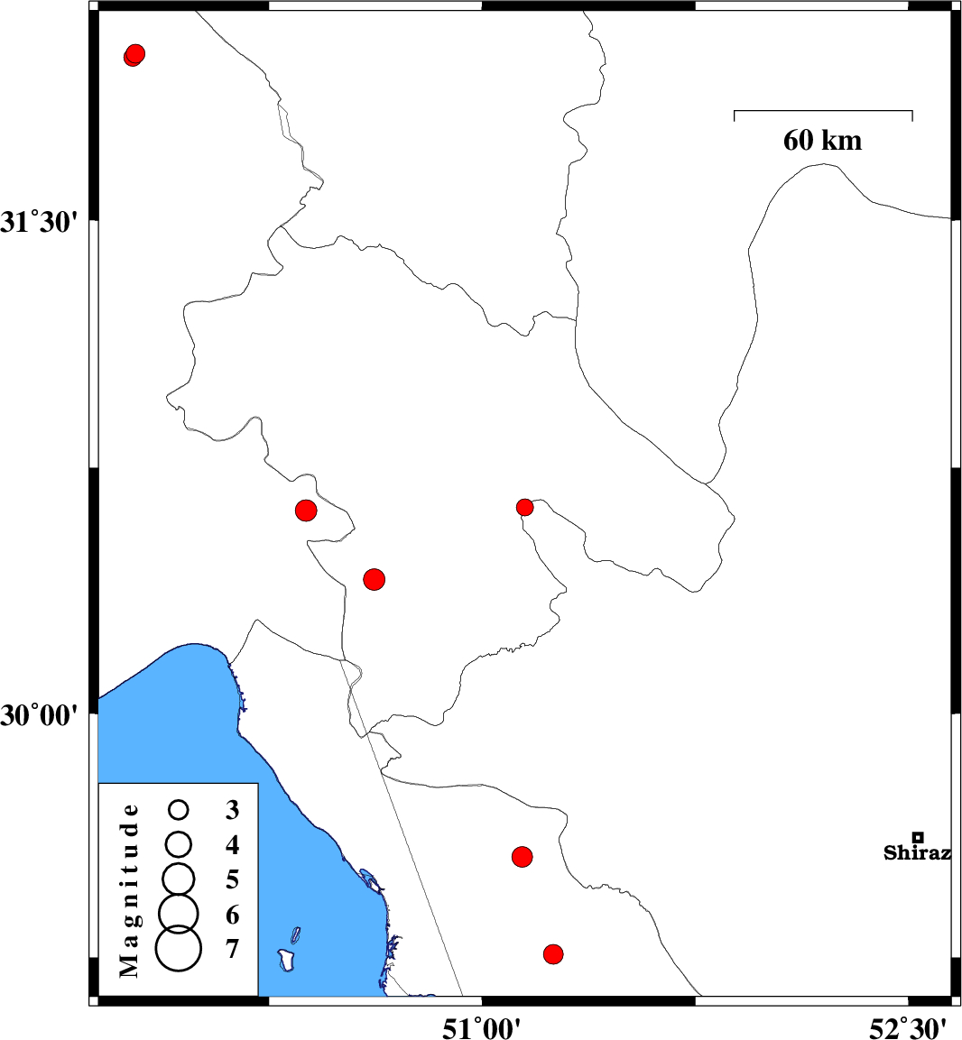 | 2012/03/29 | 04:30:55.5 | 09:00:55.5 | 29.56 | 51.14 | 14 | ML:3.2 | Bushehr Province, 34 km North of Borazjan | ||
