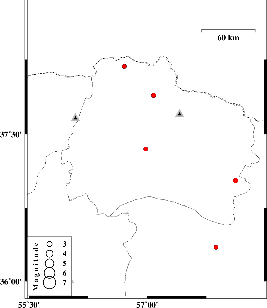 | 2012/04/11 | 10:39:28.9 | 15:09:28.9 | 37.03 | 58.12 | 14 | ML:2.8 | Khorasan(center) Province, 36 km West of Quchan | ||
