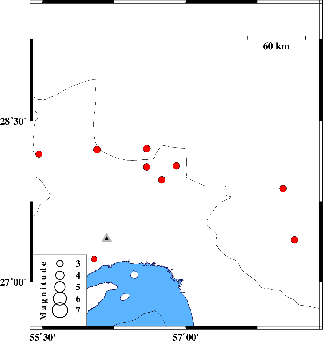 | 2012/04/09 | 00:30:19.4 | 05:00:19.4 | 28.07 | 56.59 | 10 | ML:3.3 | Hormozgan Province, 73 km South-East of Hajiabad | ||