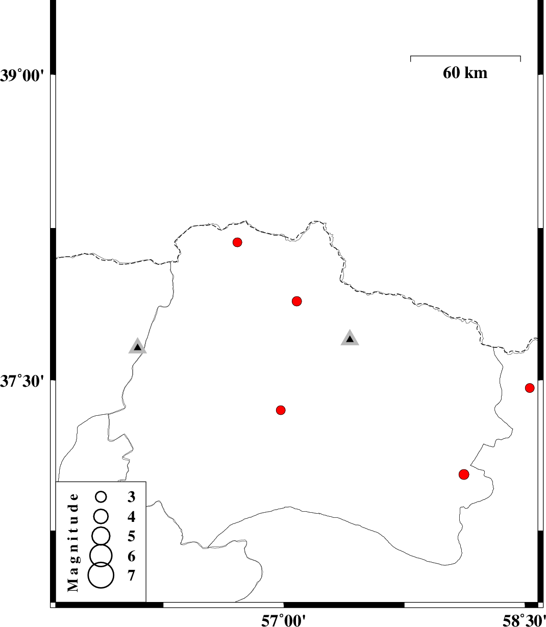 | 2012/04/13 | 00:08:10.1 | 04:38:10.1 | 37.46 | 58.53 | 14 | ML:2.6 | Khorasan(center) Province, 39 km North of Quchan | ||