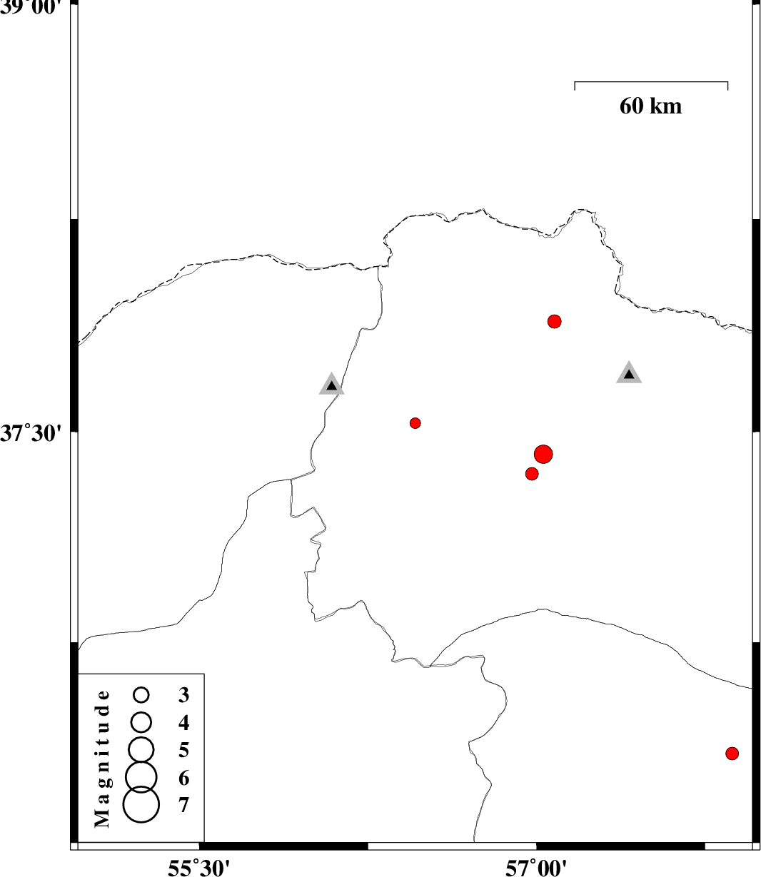 | 2012/04/15 | 09:02:20.3 | 13:32:20.3 | 37.35 | 56.98 | 46 | ML:2.5 | Khorasan(north) Province, 22 km South of Ashkhaneh | ||