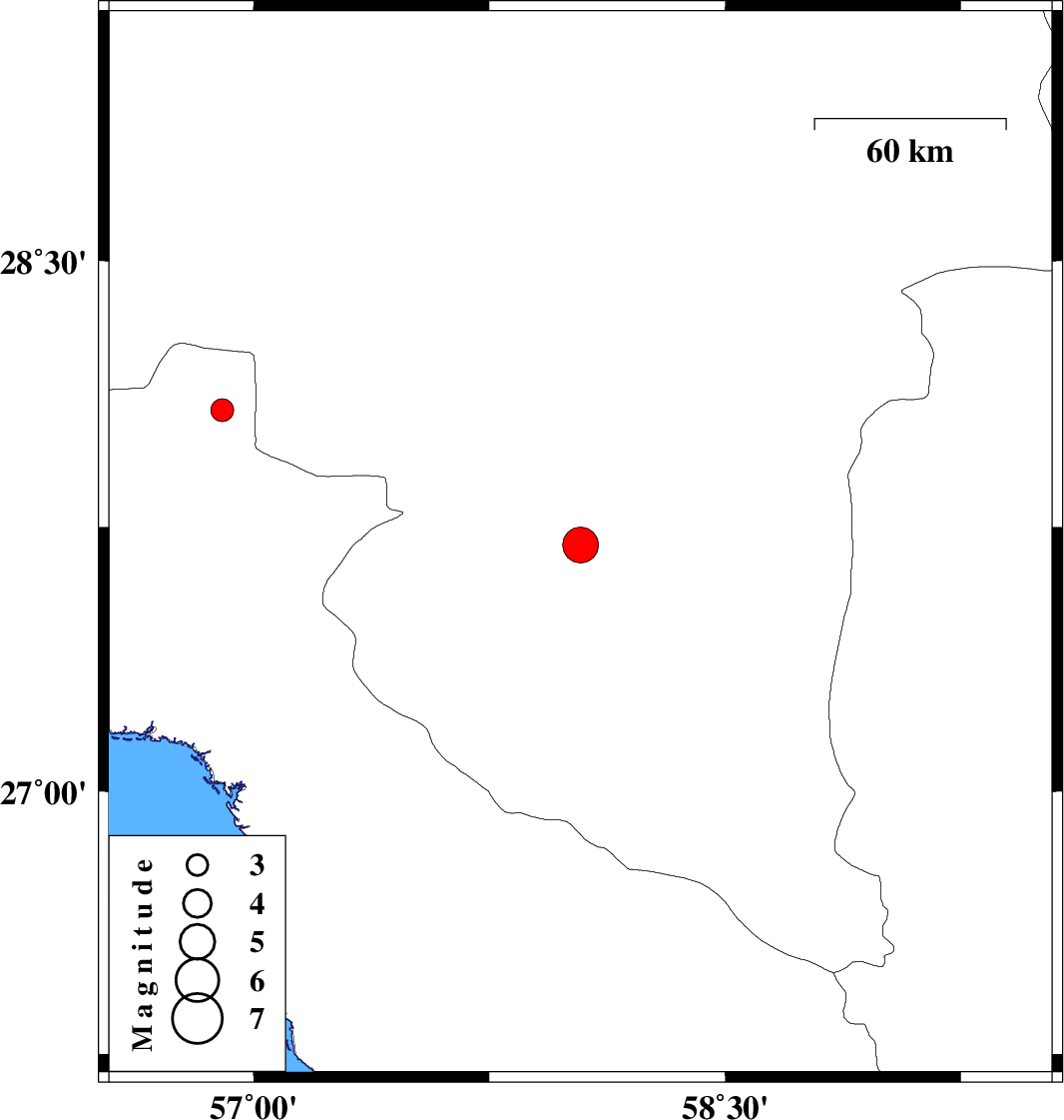 | 2012/04/18 | 17:40:36.2 | 22:10:36.2 | 27.7 | 58.04 | 15 | ML:5.1 | Kerman Province, 44 km South-East of Kahnuj | ||