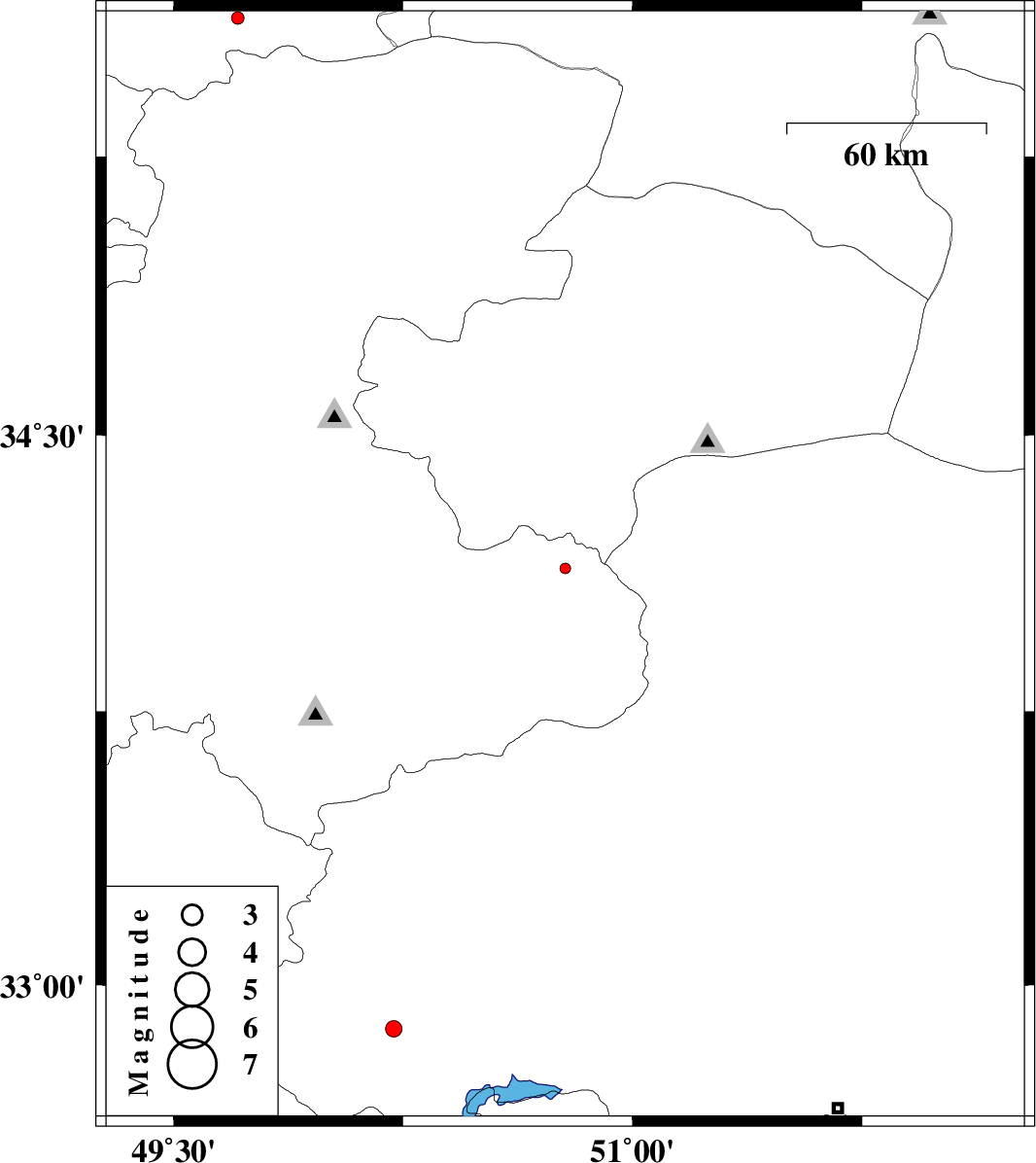 | 2012/04/19 | 07:19:20.4 | 11:49:20.4 | 34.14 | 50.78 | 18 | ML:1.6 | Markazi Province, 19 km North-East of Delijan | ||