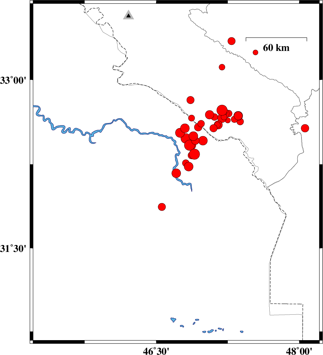 2012/04/20 01:48:42.9 06:18:42.9 32.647.1533 ML:4 Ilam Province, 15 km West of Dehloran