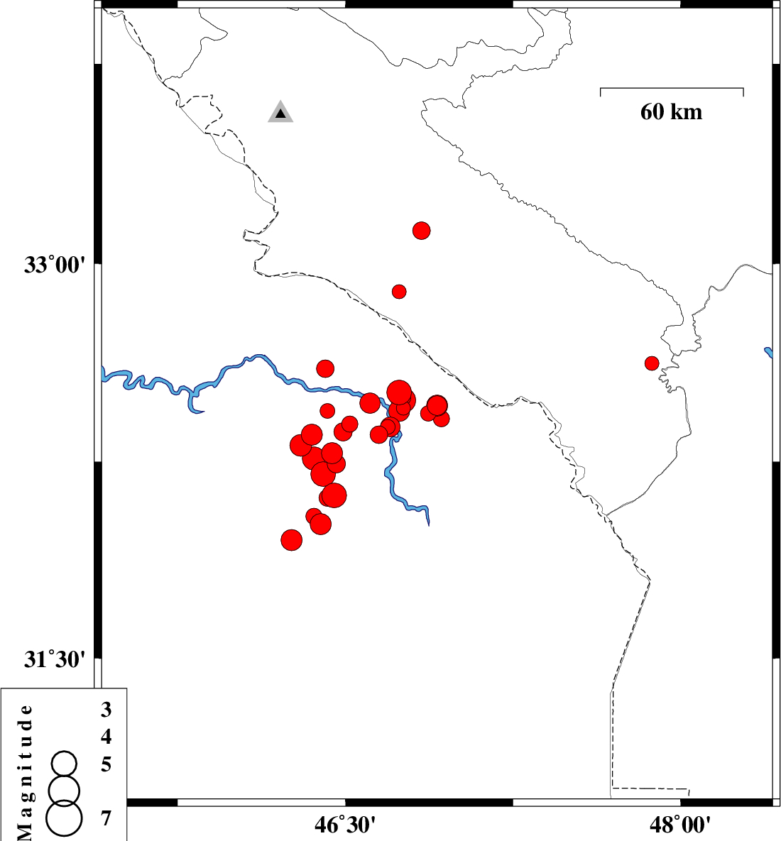 2012/04/20 15:57:58.5 20:27:58.5 32.647.1414 ML:3 Ilam Province, 15 km West of Dehloran