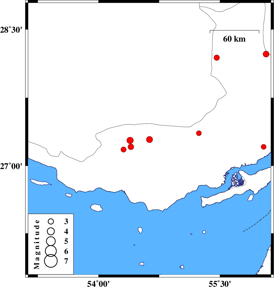 | 2012/03/25 | 05:00:07.7 | 09:30:07.7 | 27.21 | 56.04 | 14 | ML:2.8 | Hormozgan Province, 25 km West of Bandar-e abbas | ||