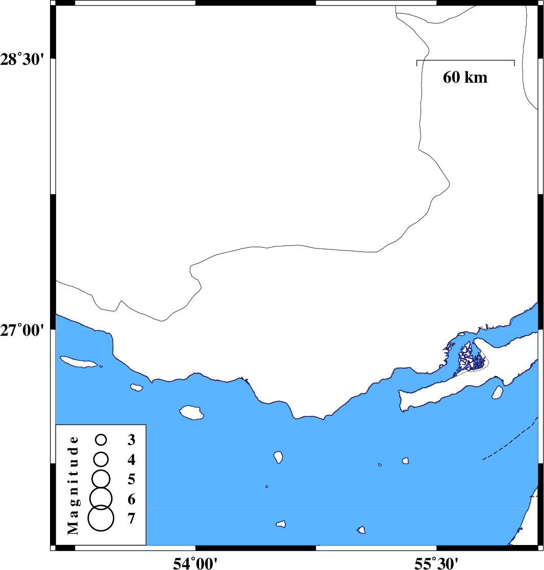 | 2012/04/21 | 18:58:17.3 | 23:28:17.3 | 27.29 | 54.63 | 14 | ML:3.5 | Hormozgan Province, 29 km East of Bastak |
