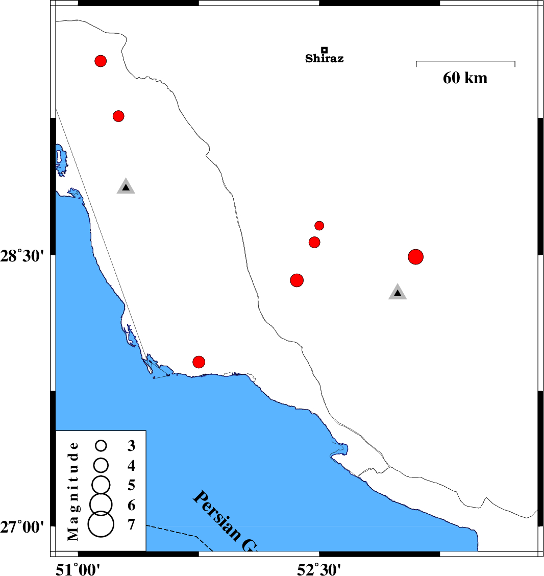 | 2012/03/29 | 04:30:55.5 | 09:00:55.5 | 29.56 | 51.14 | 14 | ML:3.2 | Bushehr Province, 34 km North of Borazjan | ||
