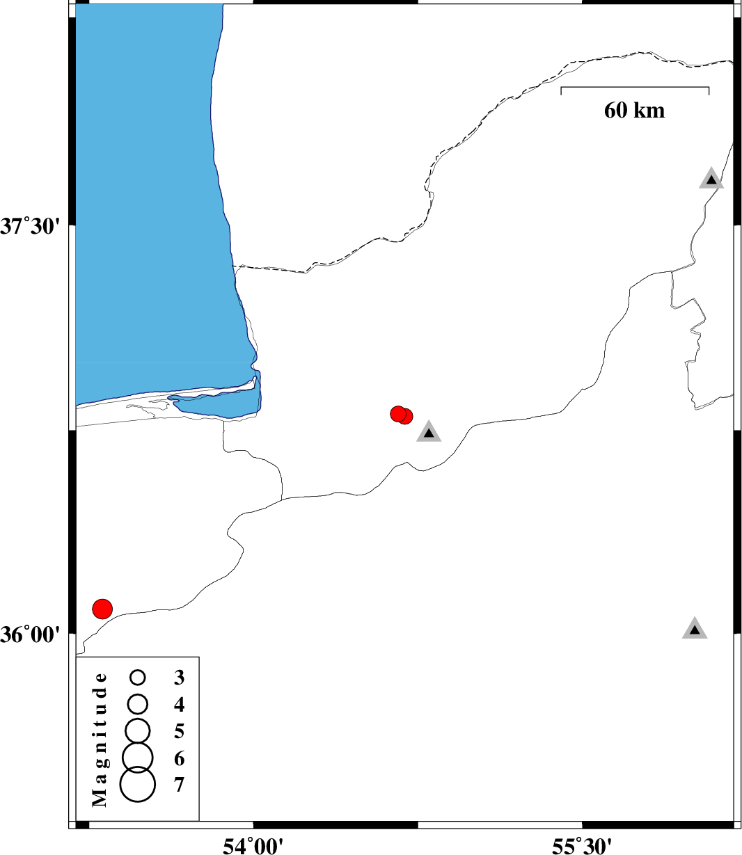 | 2012/04/29 | 00:58:25.8 | 05:28:25.8 | 36.8 | 54.69 | 16 | ML:3.3 | Golestan Province, 20 km South-West of Ali Abad | ||