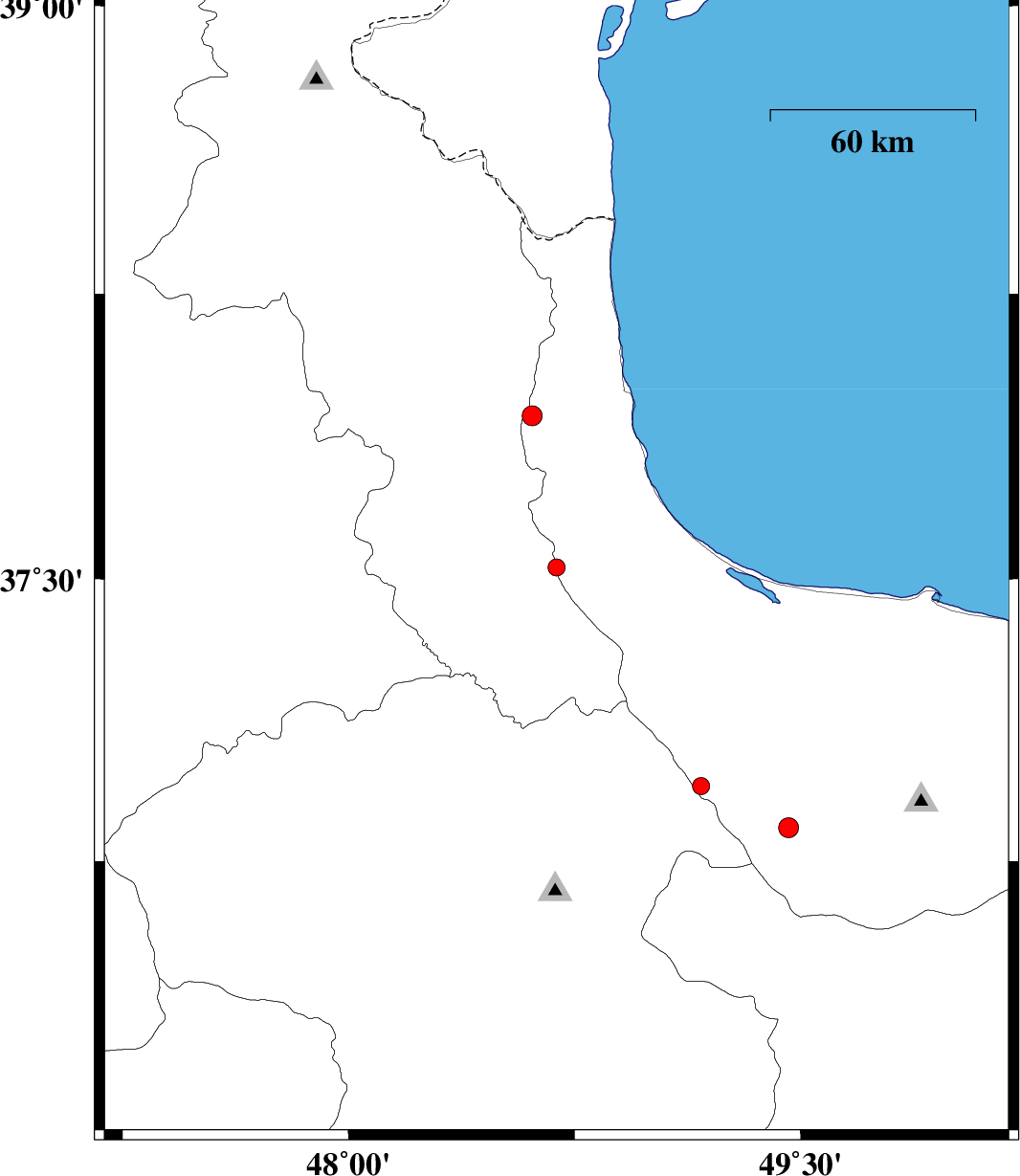 | 2012/04/29 | 09:49:17.7 | 14:19:17.7 | 37.53 | 48.69 | 14 | ML:2.5 | Ardebil Province, 18 km East of Khalkhal | ||