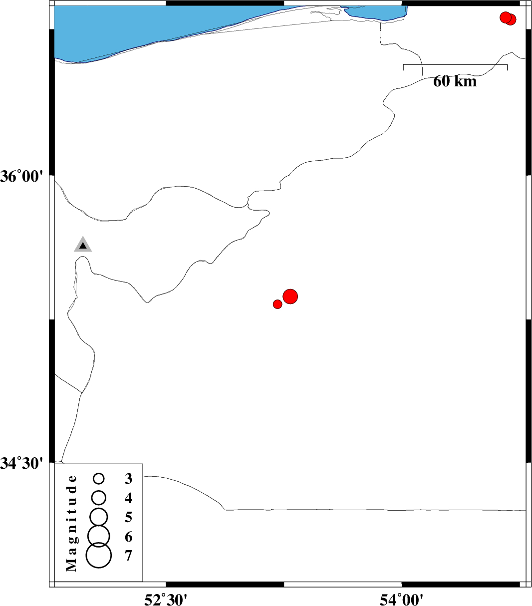 | 2012/04/29 | 00:58:25.8 | 05:28:25.8 | 36.8 | 54.69 | 16 | ML:3.3 | Golestan Province, 20 km South-West of Ali Abad |