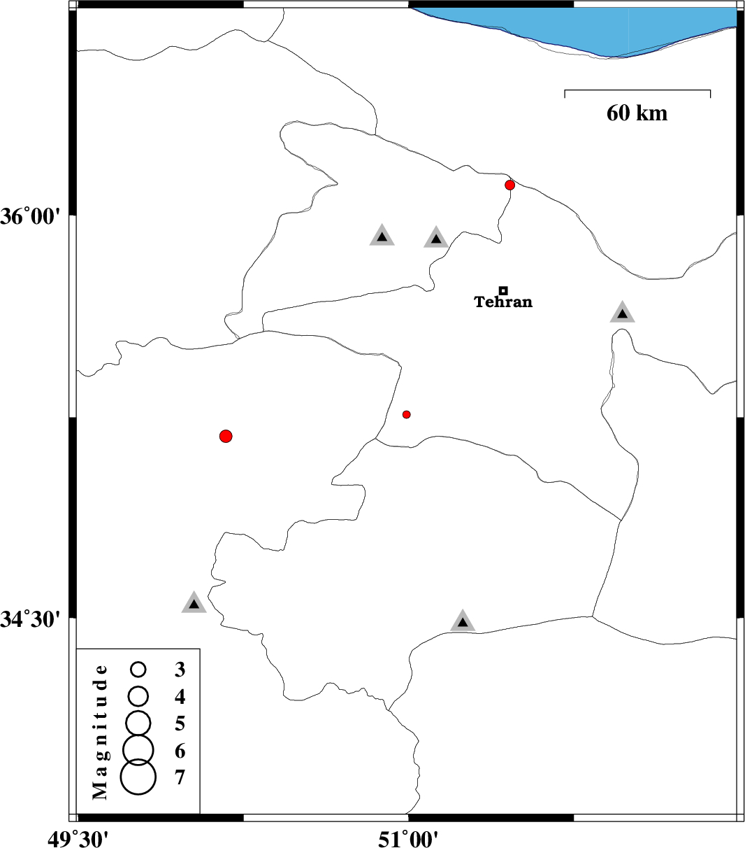 | 2012/04/29 | 14:56:30.1 | 19:26:30.1 | 35.26 | 50.99 | 40 | ML:1.5 | Tehran Province, 26 km South of Robatkarim | ||