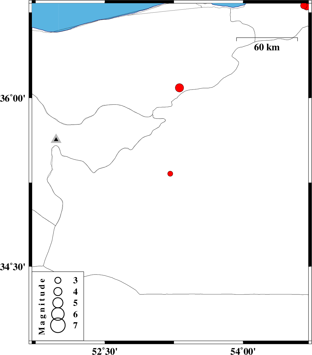 | 2012/04/29 | 00:58:25.8 | 05:28:25.8 | 36.8 | 54.69 | 16 | ML:3.3 | Golestan Province, 20 km South-West of Ali Abad | ||