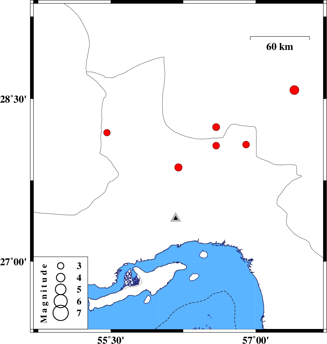 | 2012/04/01 | 09:29:57.9 | 13:59:57.9 | 28.19 | 55.46 | 38 | ML:3.1 | Hormozgan Province, 45 km South-West of Hajiabad |