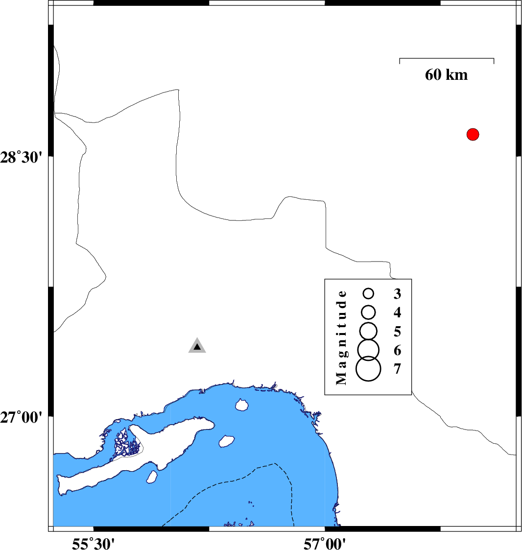 2012/05/02 | 08:07:36.0 | 12:37:36.0 | 27.86 | 56.74 | 14 | ML:2.8 | Hormozgan Province, 69 km North-West of Dehbarez | ||