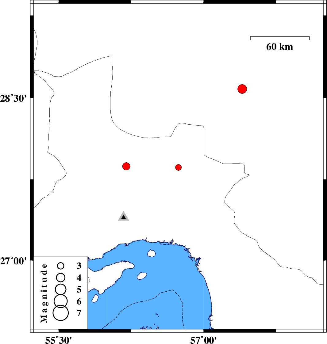 | 2012/04/29 | 11:58:38.4 | 16:28:38.4 | 28.58 | 57.4 | 31 | ML:4.2 | Kerman Province, 35 km West of Jiroft |