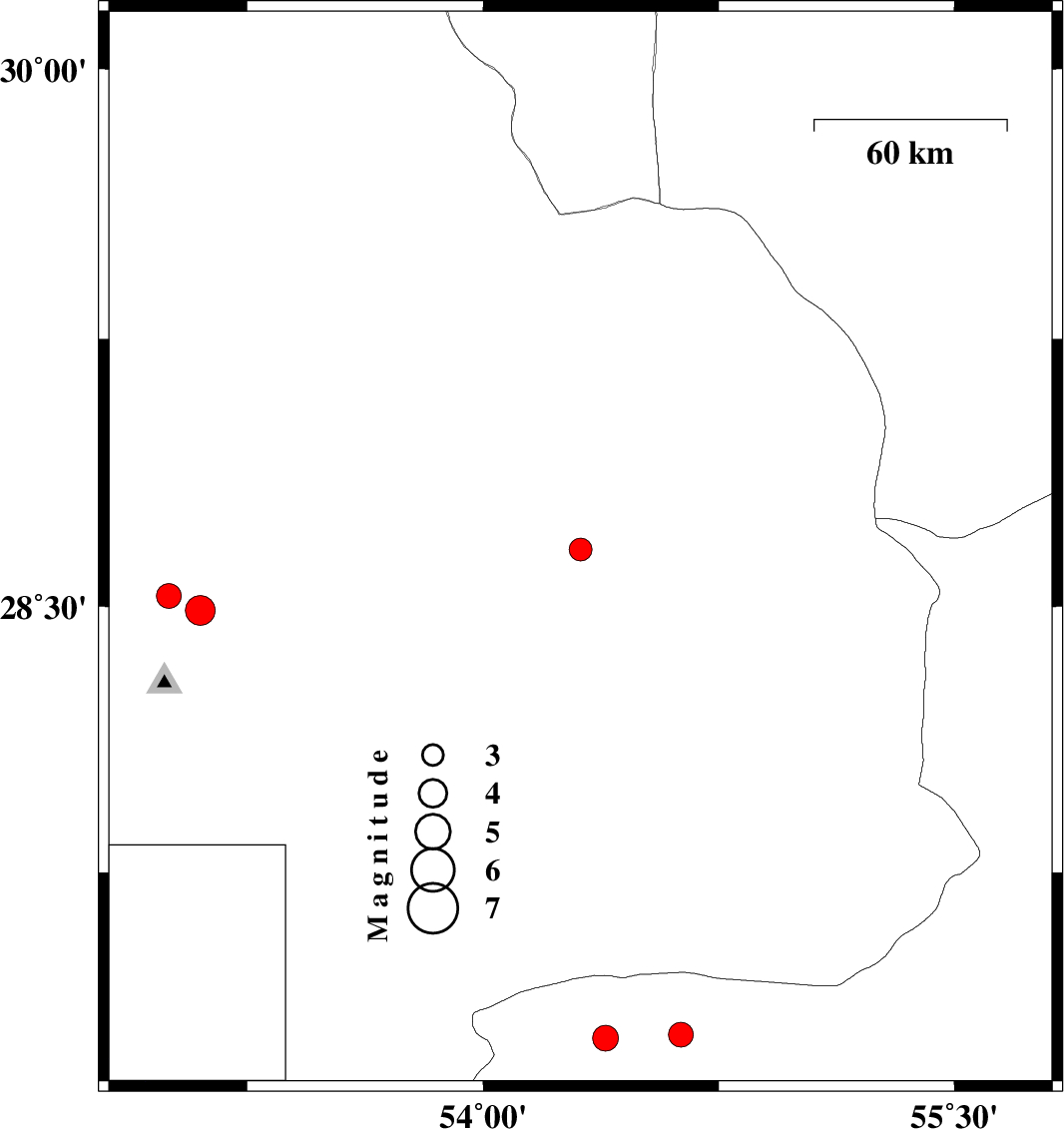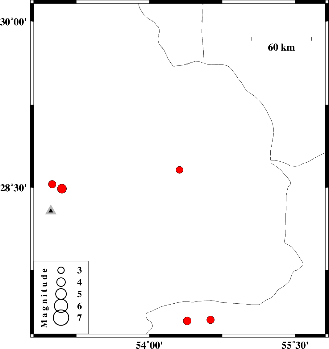 | 2012/05/03 | 02:12:29.2 | 06:42:29.2 | 28.66 | 54.31 | 14 | ML:3.2 | Fars Province, 24 km West of Darab | ||