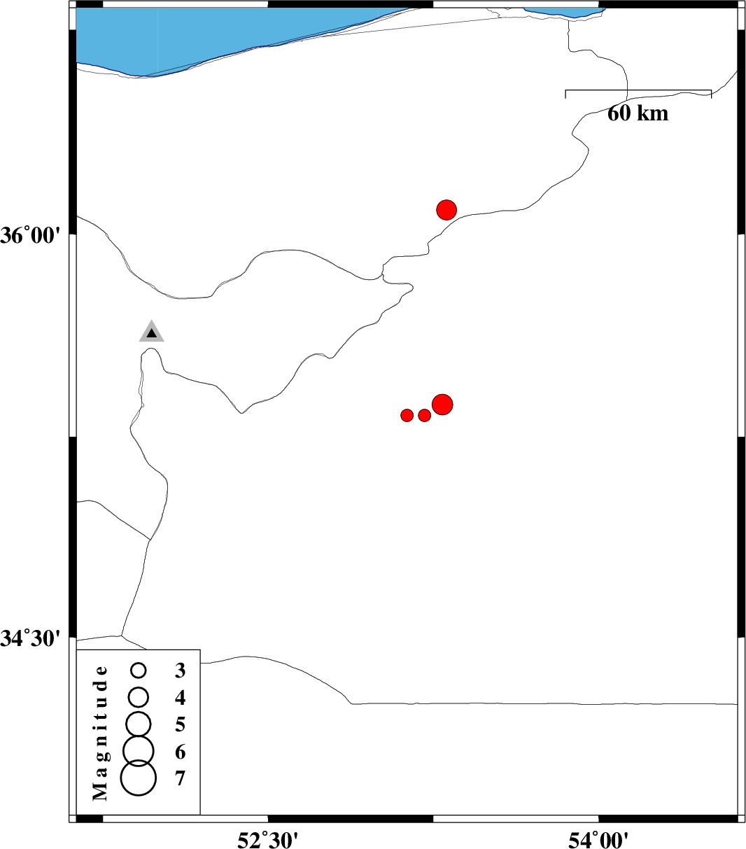 | 2012/04/30 | 01:33:23.3 | 06:03:23.3 | 35.37 | 53.29 | 29 | ML:4.2 | Semnan Province, 24 km South-West of Semnan | ||