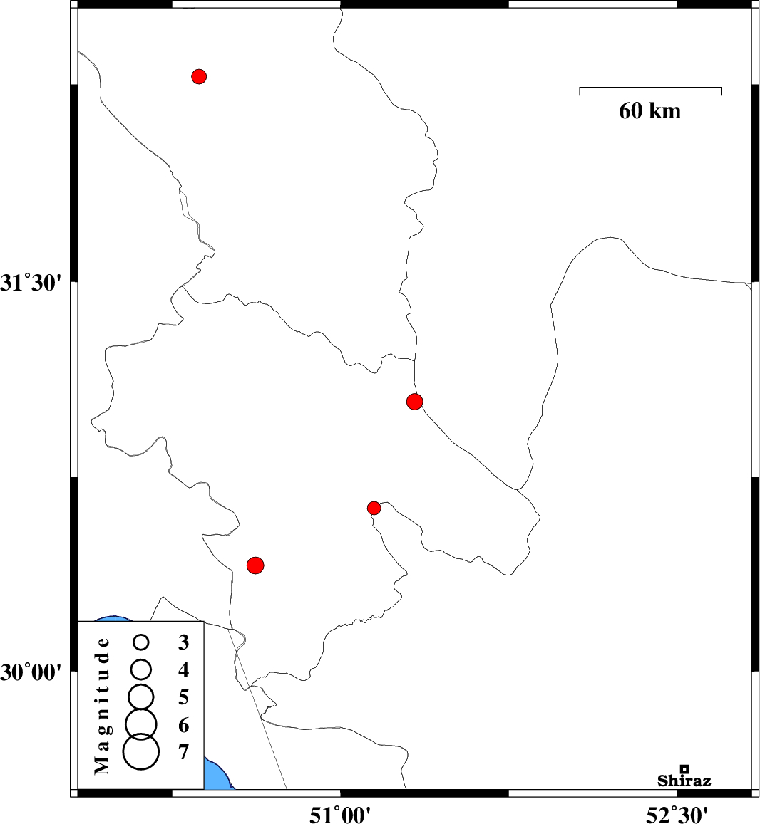 | 2012/05/04 | 08:34:28.3 | 13:04:28.3 | 31.04 | 51.33 | 14 | ML:3.2 | Kohkiluieh va boyerahmad Province, 22 km North-West of Sisakht | ||
