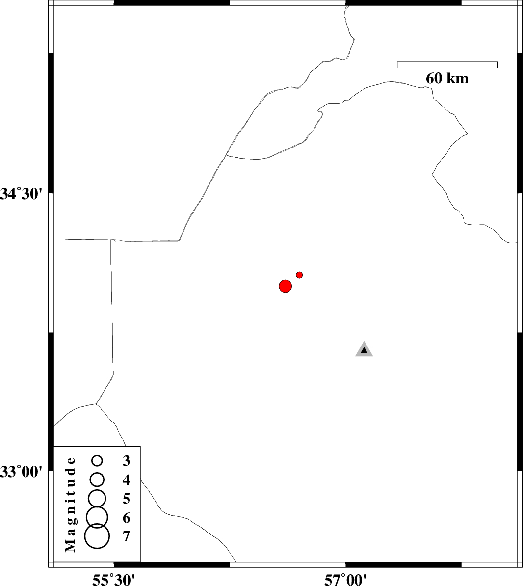 | 2012/05/04 | 17:49:31.7 | 22:19:31.7 | 34.06 | 56.7 | 14 | ML:1.9 | Yazd Province, 55 km North-West of Tabas | ||