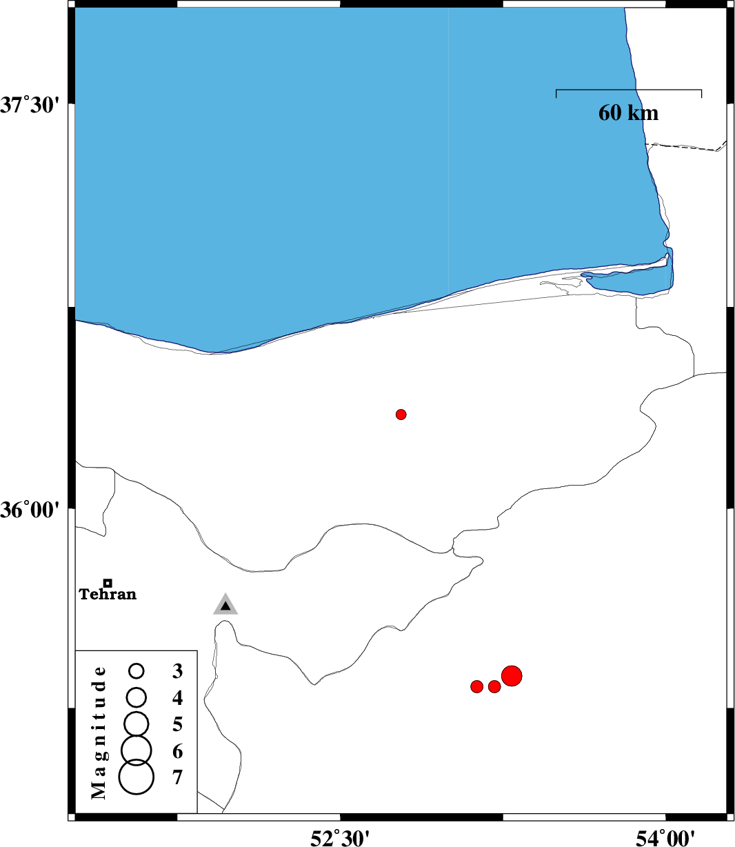 | 2012/04/30 | 01:33:23.3 | 06:03:23.3 | 35.37 | 53.29 | 29 | ML:4.2 | Semnan Province, 24 km South-West of Semnan | ||