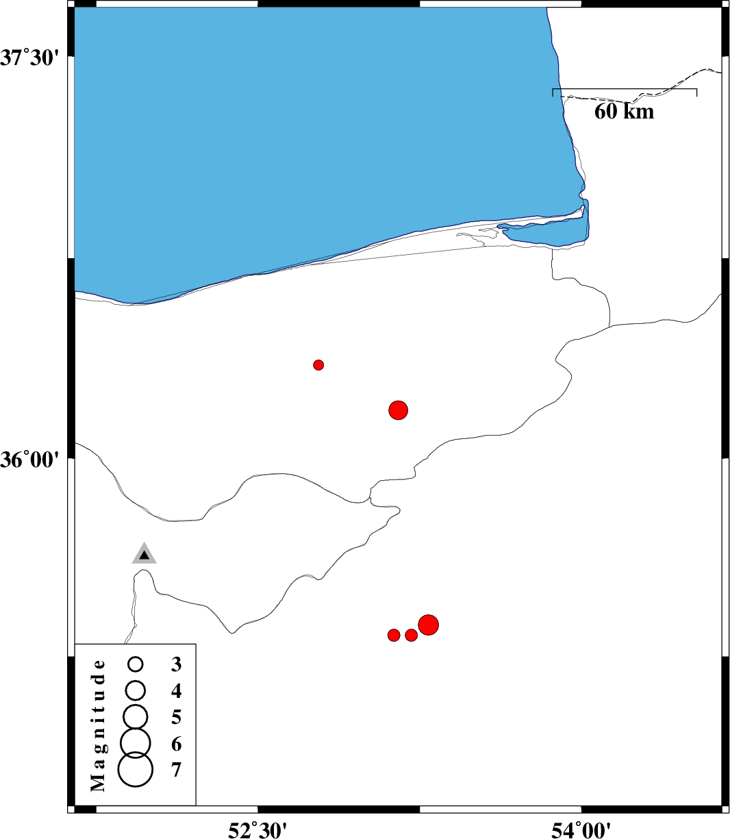 | 2012/05/03 | 03:14:45.0 | 07:44:45.0 | 35.33 | 53.13 | 14 | ML:2.5 | Semnan Province, 36 km South-West of Semnan | ||