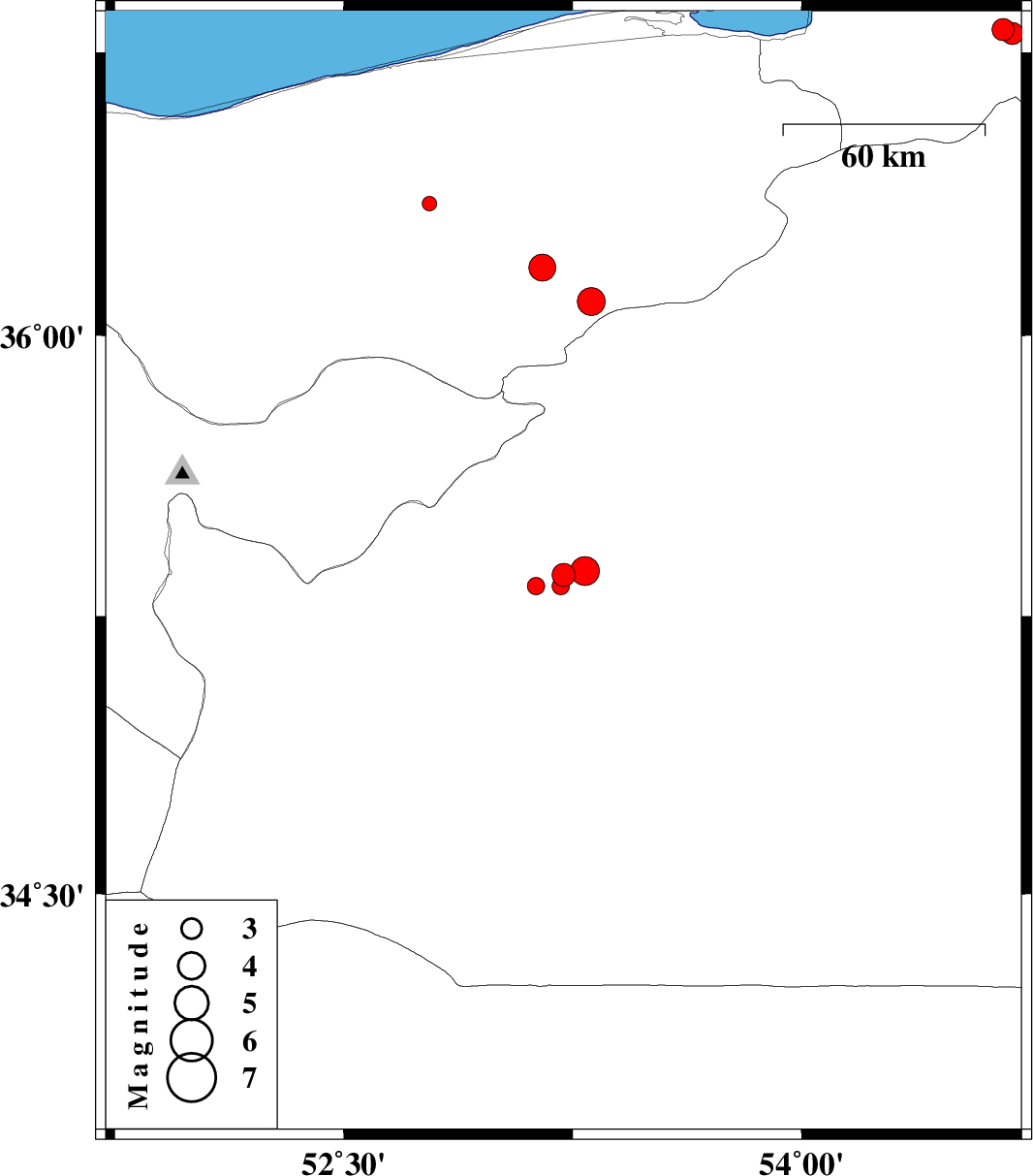 | 2012/04/30 | 01:33:23.3 | 06:03:23.3 | 35.37 | 53.29 | 29 | ML:4.2 | Semnan Province, 24 km South-West of Semnan | ||
