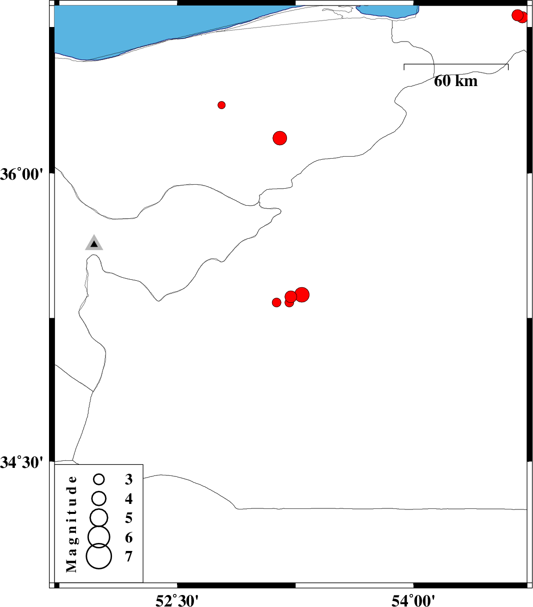 | 2012/05/03 | 03:14:45.0 | 07:44:45.0 | 35.33 | 53.13 | 14 | ML:2.5 | Semnan Province, 36 km South-West of Semnan | ||