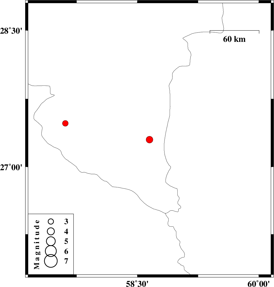 | 2012/05/07 | 00:29:11.4 | 04:59:11.4 | 27.3 | 58.65 | 15 | ML:3.8 | Kerman Province, 114 km South-East of Manujan |